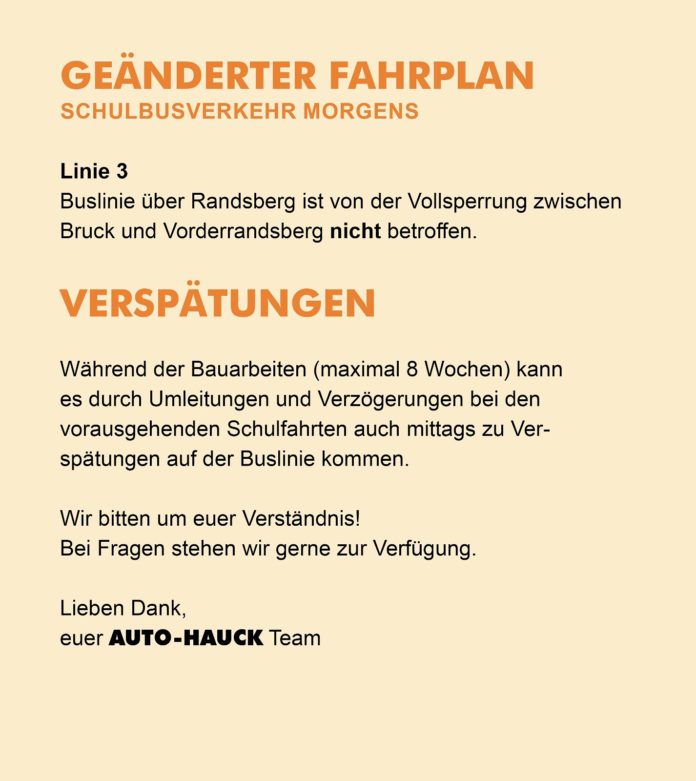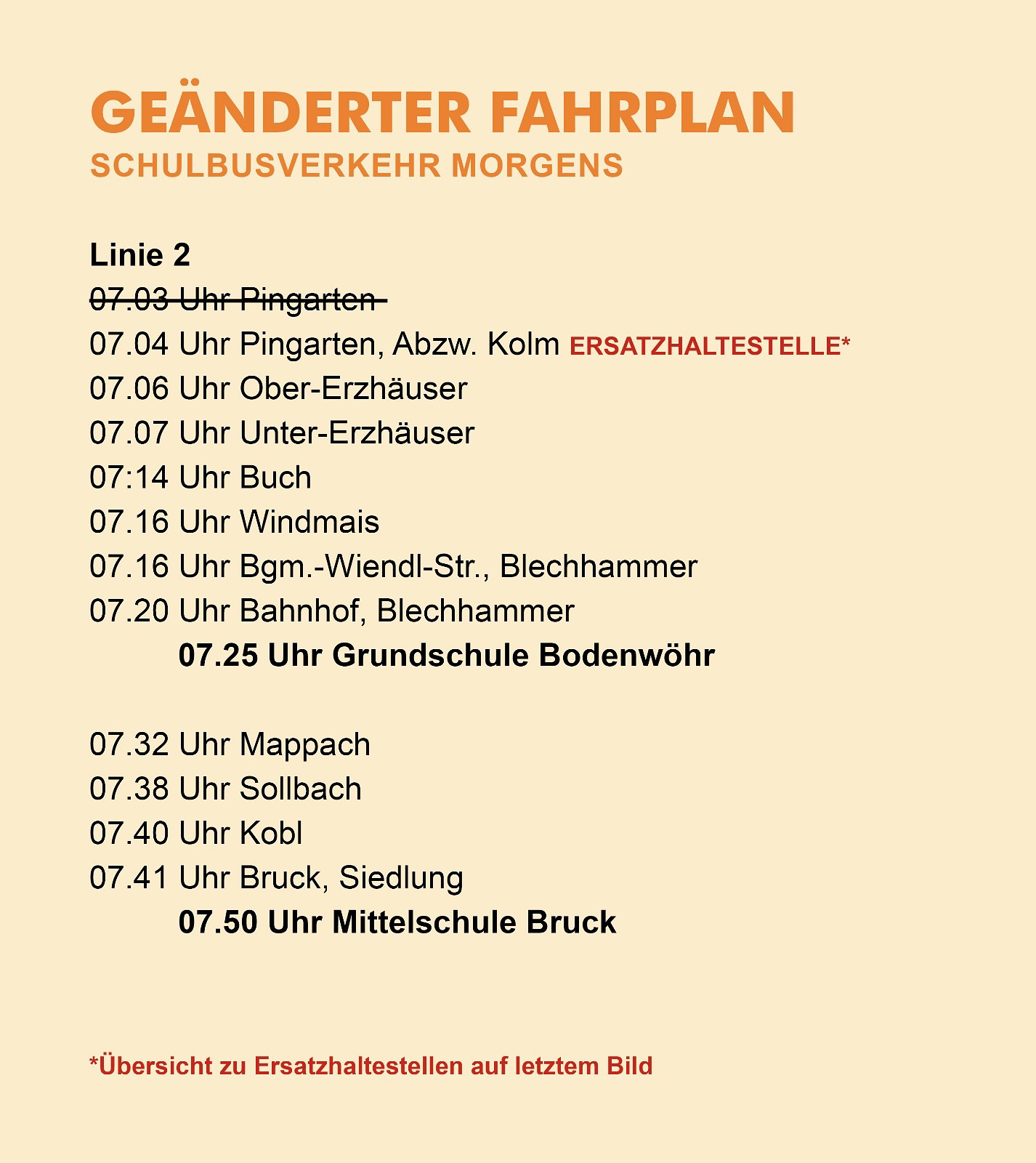 Aufgrund der Baustellen rund um Bodenwöhr und Bruck gilt die nächsten Wochen für die Linien morgens ein angepasster Fahrplan.