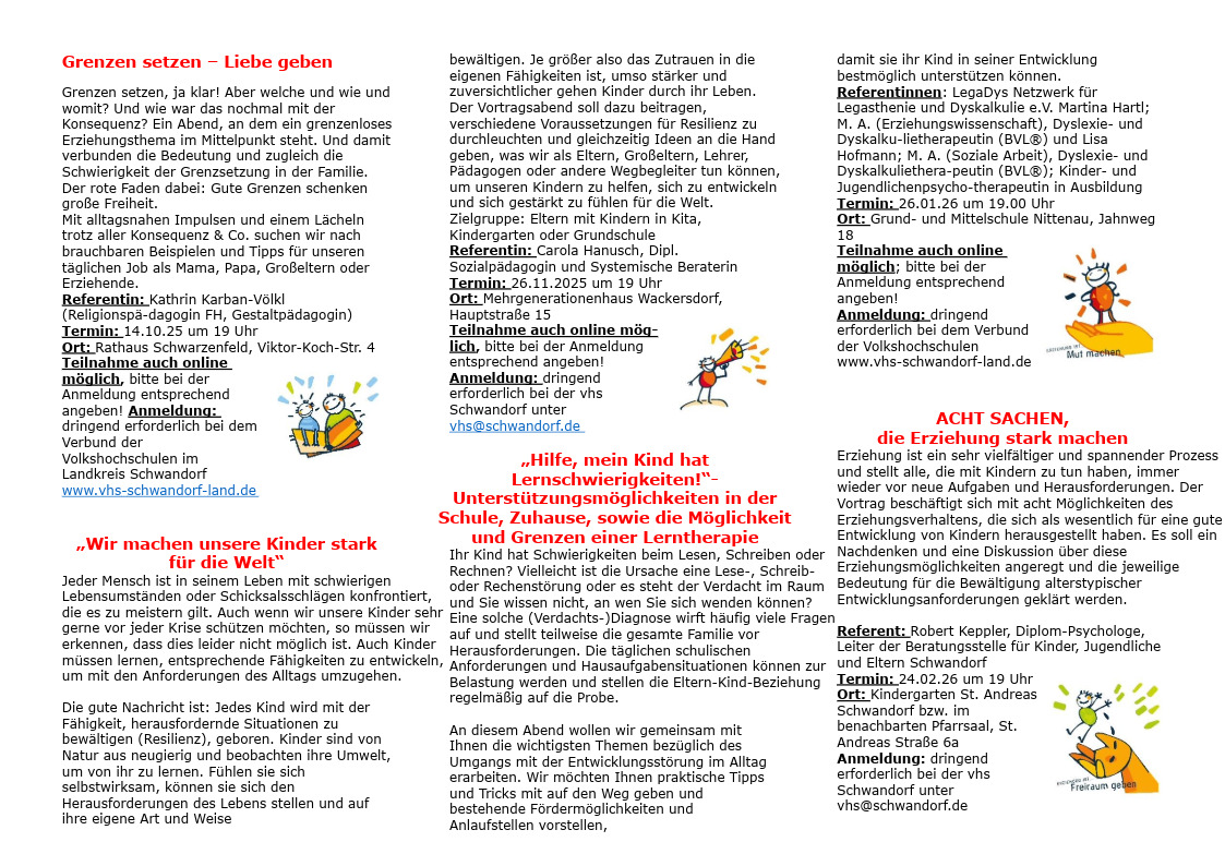 Anbei der Flyer für die neue Kursreihe „Stark durch Erziehung“, die im Oktober mit 5 Vorträgen in verschiedenen Gemeinden des Landkreises startet.