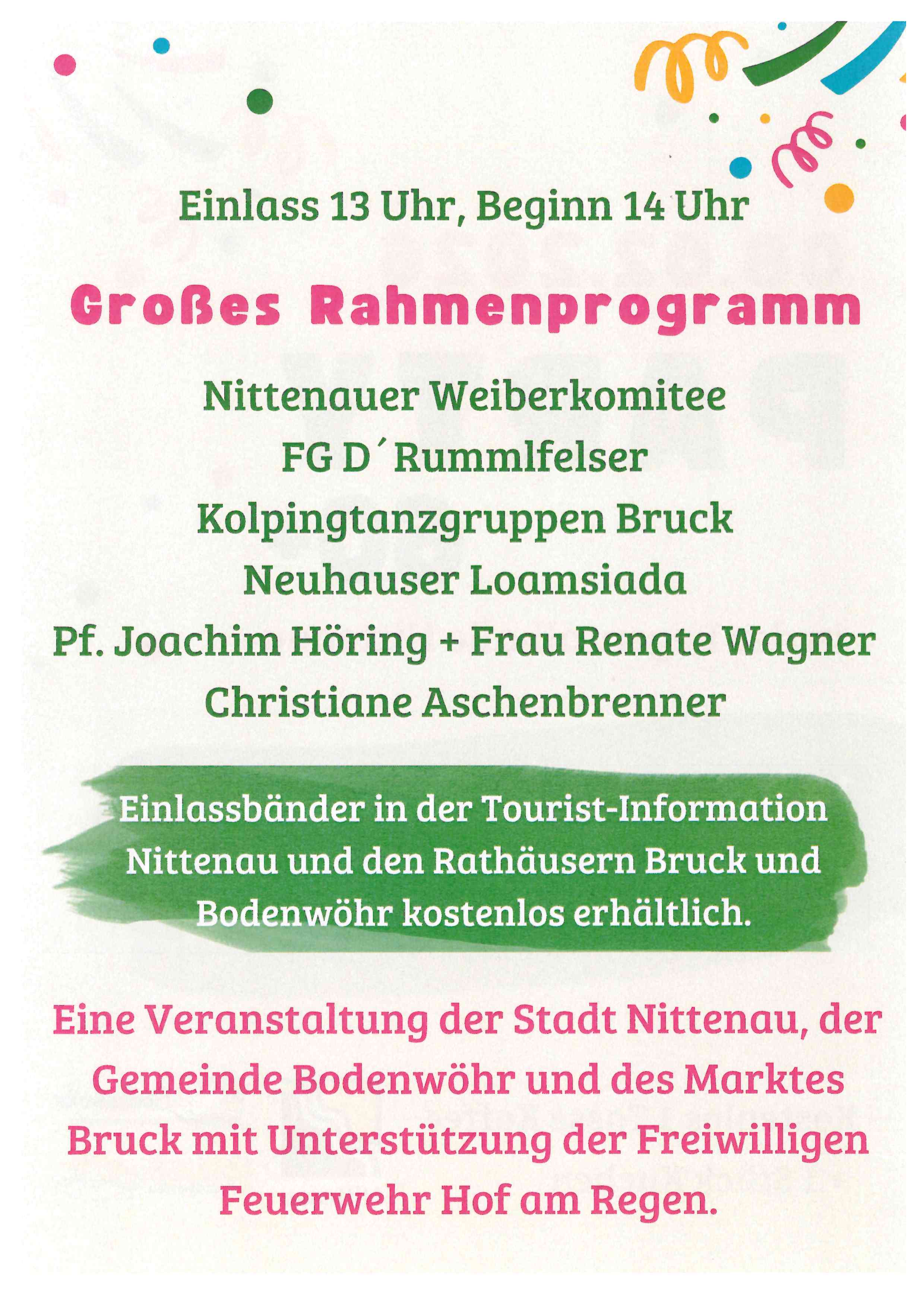 Es gibt neben Tanzrunden auch Auftritte der FG D`Rummlfelser, des Nittenauer Weiberkomitees, der Kolpingtanzgruppen Bruck und der „Neuhauser Loamsiada“. Auch Pfarrer Joachim Höring und Frau Renate Wagner sorgen für Unterhaltung. Für die passende musikalische Umrahmung sorgt Christiane Aschenbrenner.